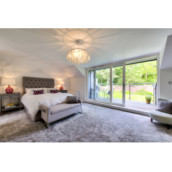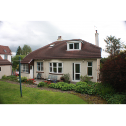Finished photos of a two-storey rear extension to this Bearsden dormer bungalow, as well as full renovation of existing property. Full width rear extension with rear zinc dormer, new garage, new patio, and new staircase position.
