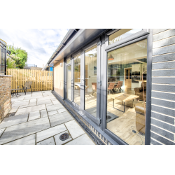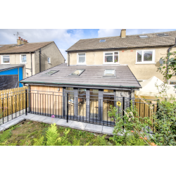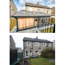 Rear single-storey extension to a semi-detached Clarkston two-storey house. The extension and alterations provide a Dining Kitchen space with lots of natural light and connection with the new sandstone patio. The stone clad retaining walls provide outdoor space on the sloping site. The vaulted ceiling increases the sense of space inside.